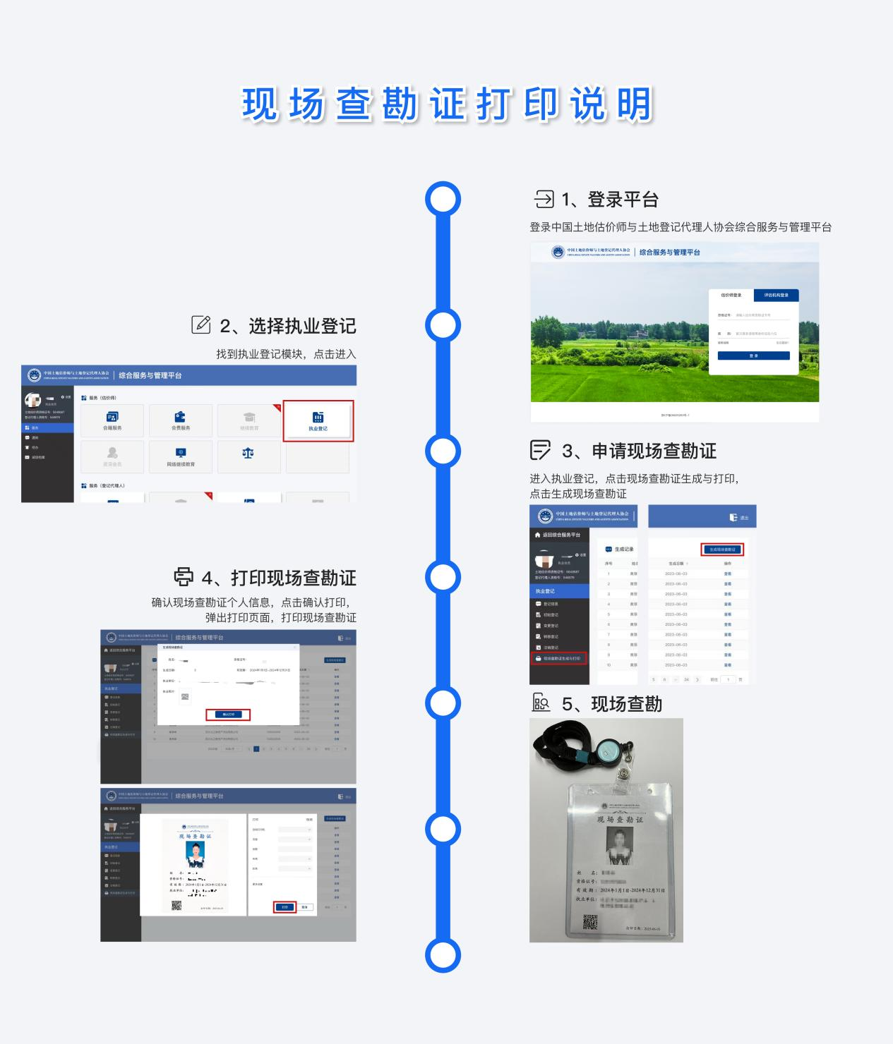 根据《关于印发<关于土地估价报告评审中典型问题的处理意见(三)>的通知》(中估协发〔2023〕23号),为规范土地估价机构现场查勘环节,确保签字土地估价师对待估宗地进行了现场查勘,中国土地估价师与土地登记代理人协会(以下简称中估协)就现场查勘环节制作了现场查勘证。自2024年1月1日开始,估价师需登录中估协综合服务平台,在线打印现场查勘证(包含姓名、执业照片、执业机构、资格证号、有效期等信息),现场查勘证在有效期内可重复使用。现场查勘时,估价师需手持或佩戴查勘证与估价对象合影,合影作为现场查勘附件之一使用。具体打印流程如下: