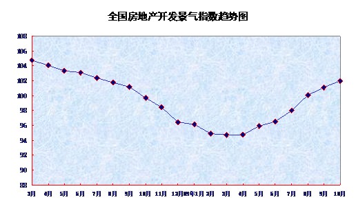 10月份,全国房地产开发景气指数(简称“国房景气指数”)为102.03,比9月份提高0.95点。
