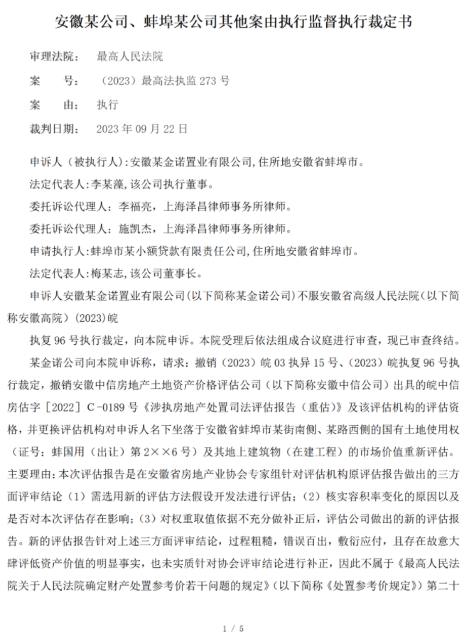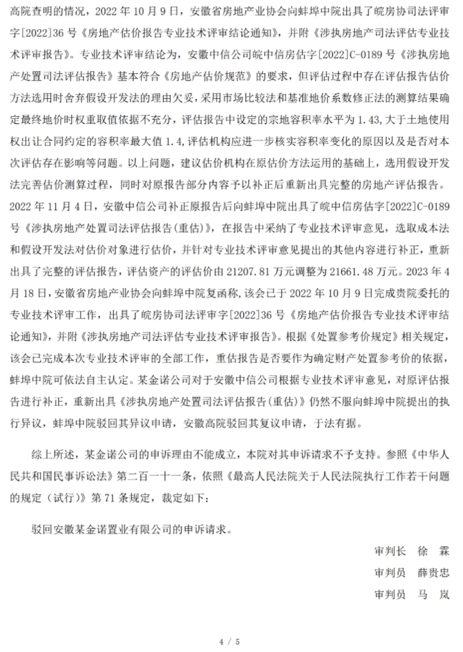 评估机构根据该评审结论,对原报告进行了补正:增加了假设开发法作为新的评估方法,对容积率等问题进行了说明,并重新出具了《涉执房地产处置司法评估报告(重估)》,评估价略有调整。但某金诺公司对该补正报告仍不服,认为其敷衍应付、技术错误百出、故意低评,遂向法院提出执行异议,要求撤销该报告并更换评估机构重新评估。其异议及复议申请均被驳回。
