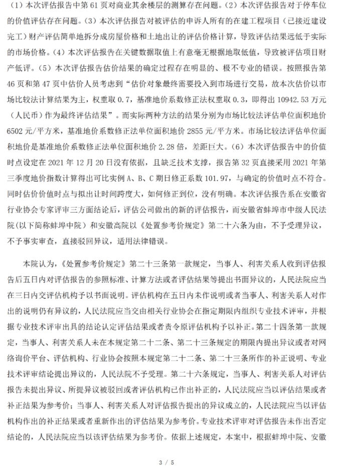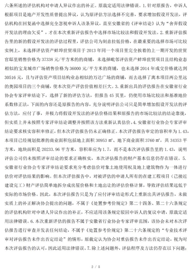 确认评估异议法定程序已合法完结:最高法首先梳理并确认了本案中评估异议处理的完整流程,即当事人异议 协会评审 机构补正。评估机构已按照行业协会的评审意见,在补正报告中增加了假设开发法、对容积率等问题进行了核实说明,这构成了对评审结论的明确回应和形式履行。行业协会随后复函法院,确认其评审工作已完成。据此,法定的异议处理程序已经走完所有环节,程序目的已达成。