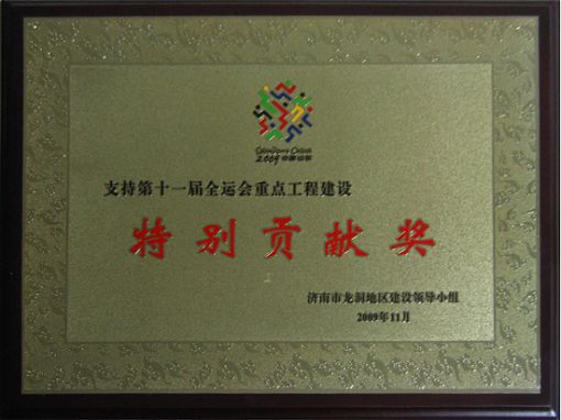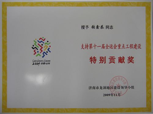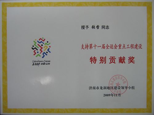 鉴于公司在上述方面的突出表现,济南市龙洞地区建设指挥小组特将“支持第十一届全运会重点工程建设特别贡献奖(单位)”颁发给我公司,以表示对我公司工作成绩的认可与赞扬。同时总经理张鑫恭同志和项目经理张哲同志也因其个人在项目中的突出贡献分别获得“支持第十一届全运会重点工程建设特别贡献奖(个人)”。